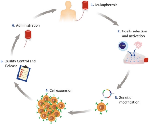 CAR-T細胞治療全流程,包括采集病患或者健康供體的外周血單核細胞(PBMC)、T細胞分離激活,T細胞體外基因修飾,CAR-T細胞體外擴增,CAR-T細胞質(zhì)量監(jiān)控,CAR-T細胞回輸病患體內(nèi)這些主要步驟。