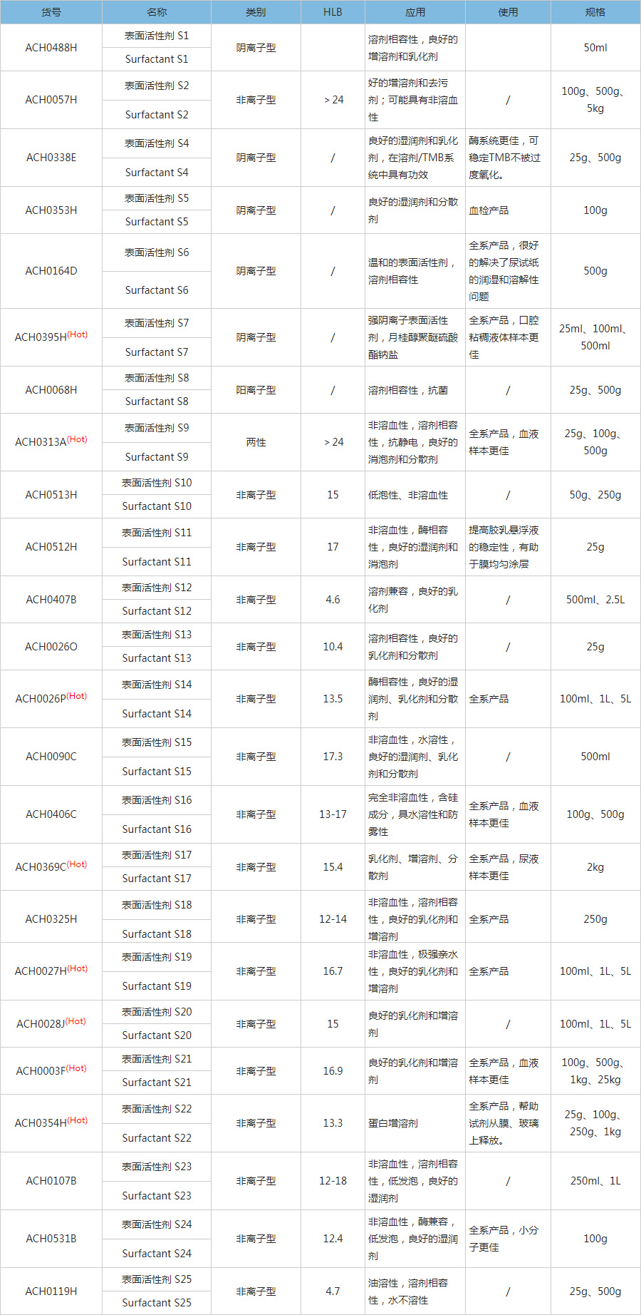 | ACH0003F(Hot) | 表面活性劑 S21 | 非離子型 | 16.9 | 良好的乳化劑和增溶劑 | 全系產(chǎn)品,血液樣本更佳 | 100g、500g、1kg、25kg |