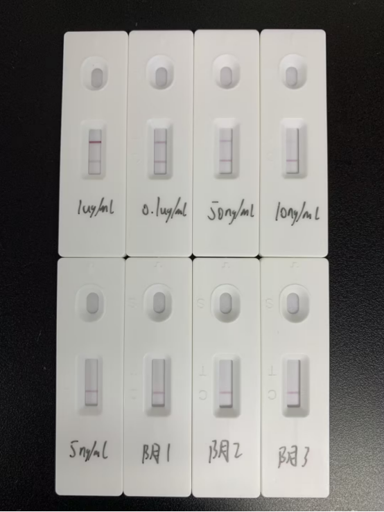 2.1.4 實(shí)驗(yàn)結(jié)果:在膠體金免疫層析平臺,采用此抗體配對組合測試呼吸道(RSV)合胞病毒抗原稀釋梯度均顯色,測試三例陰性樣品均不顯色,靈敏度可達(dá)5ng/mL,表明此抗體配對在膠體金層析平臺測試性能良好。