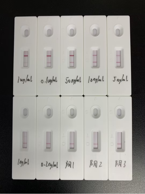 2.2.1抗體配對組合:呼吸道合胞病毒(RSV)抗體(貨號:EKY0828B)標(biāo)記彩色乳膠(噴在釋放墊上)+呼吸道合胞病毒(RSV)抗體(貨號:EKY0828A)劃膜劃膜;