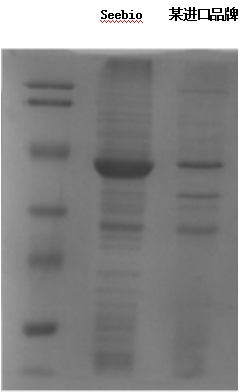 下圖數(shù)據(jù)為Seebio-21菌在不同培養(yǎng)基中的目標(biāo)蛋白表達情況,泳道“Seebio”代表培養(yǎng)基中添加Seebio品牌胰蛋白胨+酵母粉,泳道“某進口品牌”代表培養(yǎng)基中添加某進口品牌蛋白胨和酵母粉,通過SDS-PAGE電泳進行結(jié)果顯示,Seebio品牌胰蛋白胨+酵母粉組合表達效果優(yōu)于某進口品牌組合。