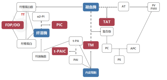 凝血酶生成是靜脈血栓形成的關(guān)鍵環(huán)節(jié), TAT是凝血酶與抗凝血酶Ⅲ(ATM)1:1結(jié)合形成的復(fù)合物,可作為凝血酶生成的分子標(biāo)志物,直接證實(shí)凝血系統(tǒng)的活化,反映凝血酶水平,是凝血系統(tǒng)激活的標(biāo)志物。其半衰期為3~15min。