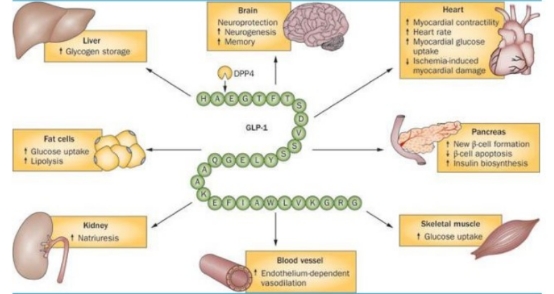 GLP-1是一種肽類激素,通過腸道釋放,并通過血腦屏障和與迷走神經(jīng)相互作用來告知大腦。它激活下丘腦、腦室周圍器官和腦干,包括孤束核(NTS),從而調(diào)節(jié)進食、能量/葡萄糖代謝和心血管系統(tǒng)。腸道 L 細胞主要負責 GLP-1的產(chǎn)生和分泌。 GLP-1釋放到門靜脈循環(huán)后,被二肽基肽酶(DPP)-4降解。 最初分泌的 GLP-1 中只有 25% 到達肝臟,并在肝臟中發(fā)生進一步降解。 只有 10%-15% 的 GLP-1 到達外周靶器官,包括胰腺、大腦、胃腸道 (GI)、肺和心臟。而GLP-1RA能模擬人體天然激素GLP-1,從而幫助調(diào)節(jié)血糖水平。