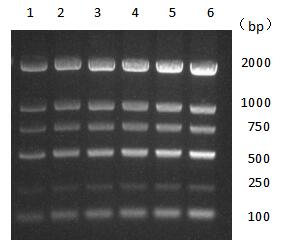 1-6分別上樣2μl,3μl,4μl,5μl,6μl,7μl;1%瓊脂糖凝膠;Gel-Green染色。
