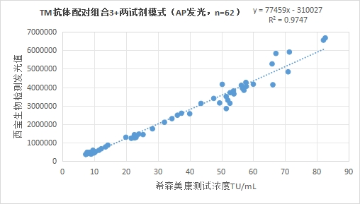 西寶生物發(fā)光(AP)平臺(tái)TM抗體配對(duì)組合3(兩試劑模式)與希森美康 TM試劑(化學(xué)發(fā)光法)賦值的臨床樣本相關(guān)性R2>0.95,相關(guān)性良好;