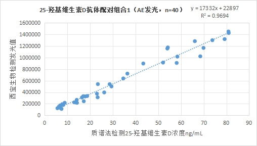 3.1.1 西寶生物發(fā)光(AE)平臺(tái)25-羥基維生素D抗體配對(duì)組合1與質(zhì)譜法賦值的臨床樣本相關(guān)性R2>0.95,相關(guān)性良好;
