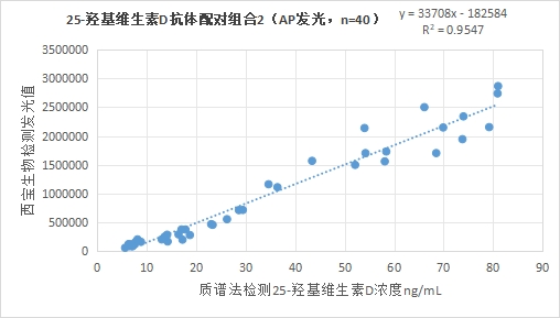 3.2.1西寶生物發(fā)光(AP)平臺(tái)25-羥基維生素D抗體配對(duì)組合2與質(zhì)譜法賦值的臨床樣本相關(guān)性R2在0.95左右,相關(guān)性良好;