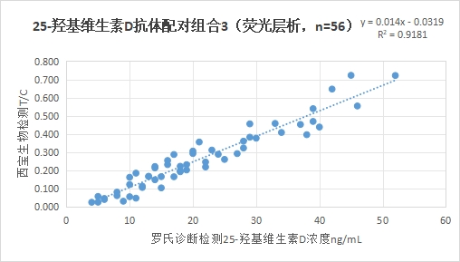 西寶生物熒光免疫層析平臺(tái)25-羥基維生素D抗體配對(duì)組合3與羅氏診斷25-羥基維生素D試劑(電化學(xué)發(fā)光法)賦值的臨床樣本相關(guān)性R2>0.90,相關(guān)性較好。